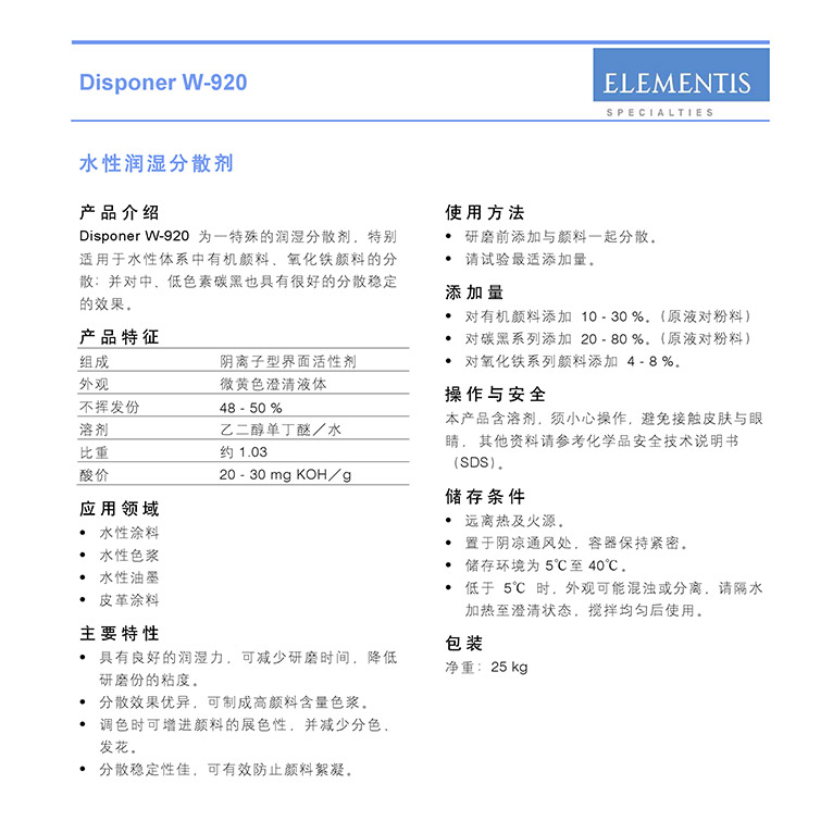 产品型号海明斯德谦润湿分散剂Disponer W-920