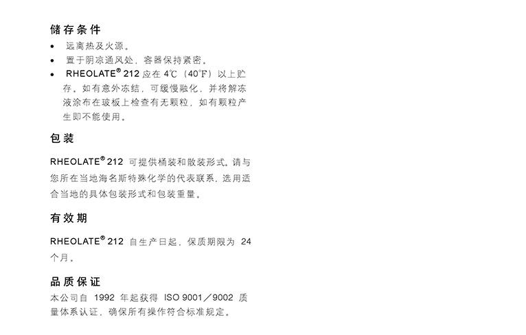 RHEOLATE。212是一缔合型流变助剂,通常乳液颗粒越小其增稠效率越好,这是由于其与乳液接触的表面积增大,同时其作用效果还受到体系中其他组分的影响,所以其效能必须在整个配方系统来评估是很重要的有关 RHEOLATE。212的详细资料可在海名斯公司的流变学手册中找到