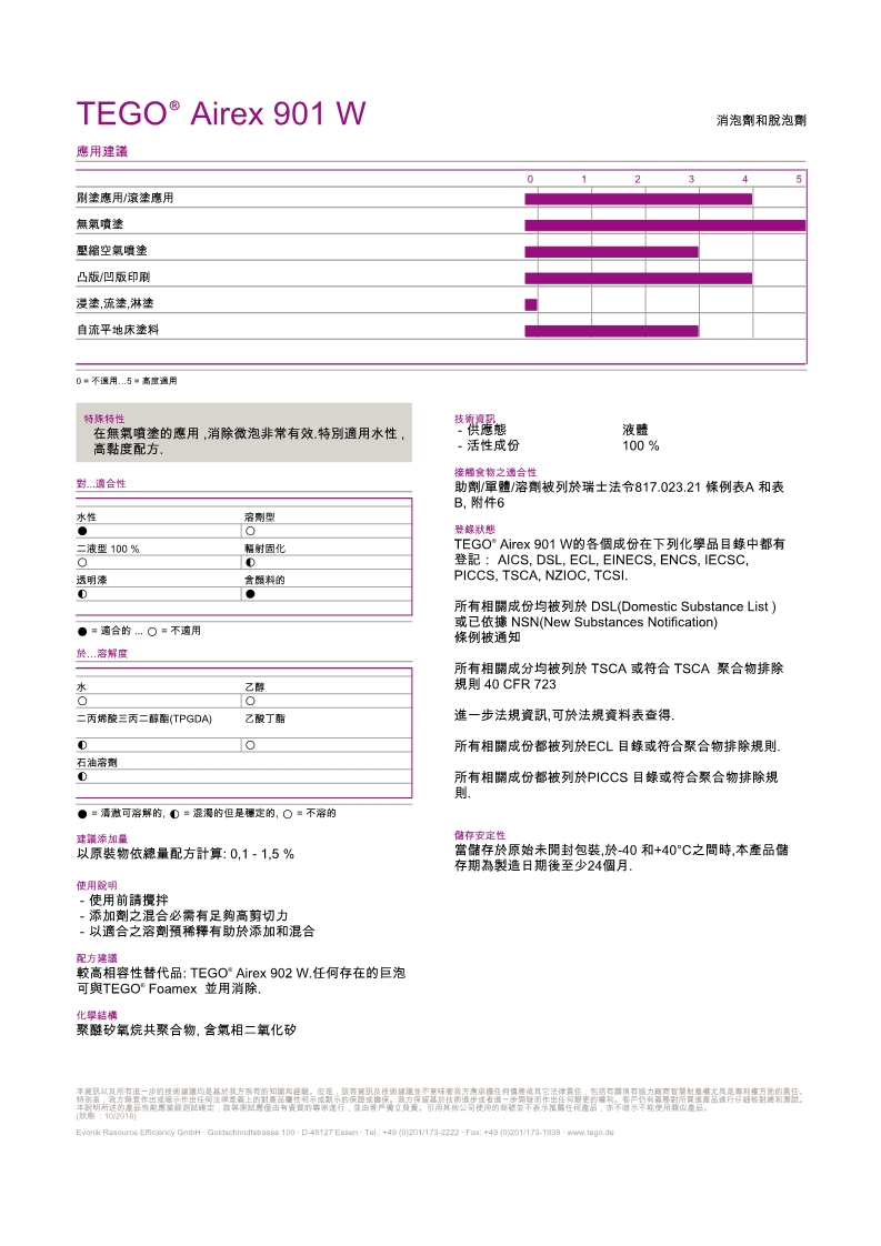 迪高消泡剂Airex 901W可普遍用于清漆和色漆配方中,特别适用于乳液体系,如纯丙乳液体系,苯丙乳液体系等。