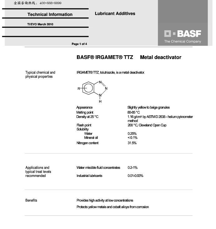 德国巴斯夫 D-BASF油性金属钝化剂 IRGAMET TTZ为甲基苯并三唑,是水溶性金属钝化剂。