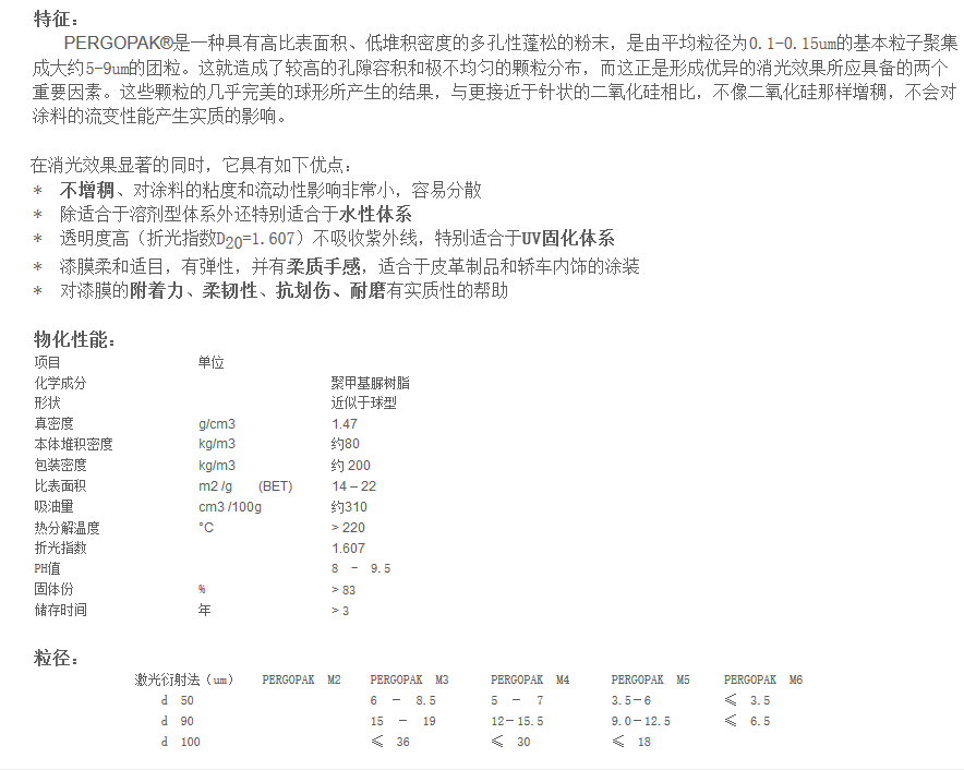 产品特性:PERGOPAK®是一种特殊的有机聚合物,在涂料行业中,可作为清漆及色漆的消光剂。其独特的化学结构,含0.6%的活性羟甲基可以在涂料树脂成膜的过程中参与交联,促进漆膜收缩聚集成均匀凹凸的表面而产生消光,同时也加强了漆膜的硬度和抗磨耗性。