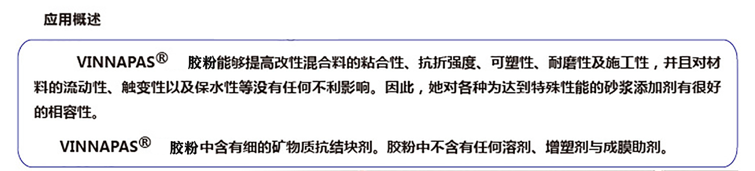 三、功能多样,用途广泛瓦克可再分散乳胶粉328还可用于配制: ·柔性抗裂抹灰——即使基材发生轻微移动也可避免开裂 ·柔性瓷砖胶粘剂——可粘附于几乎任何种类的基材且可补偿瓷砖与基材之间变形差而产生的张力 ·高效勾缝剂、防水砂浆、修补砂浆、自流平砂浆和粉末涂料 328可再分散乳胶粉特别适用于与其他无机粘合剂如水泥、石灰以及石膏混合使用或者单独作为粘结成分,用于制造柔性建筑粘合剂、墙面与地面找平材料、填缝剂、抹灰以及修补砂浆等。