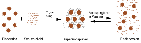 乳液的微粒直径通常在0.1至5微米(μm)之间。许多单个的乳液颗粒在进行喷雾干燥时,能够聚合成一个可再分散乳胶粉颗粒,乳液微粒(直径约100μm)中的保护胶体基体能够分离乳液微粒(直径约1μm),确保聚合物颗粒在干燥过程中,或存储时不会发生不可逆转的成膜现象。乳胶粉喷雾干燥后加入防结块剂,以防止粉末颗粒在存储时凝结成块。