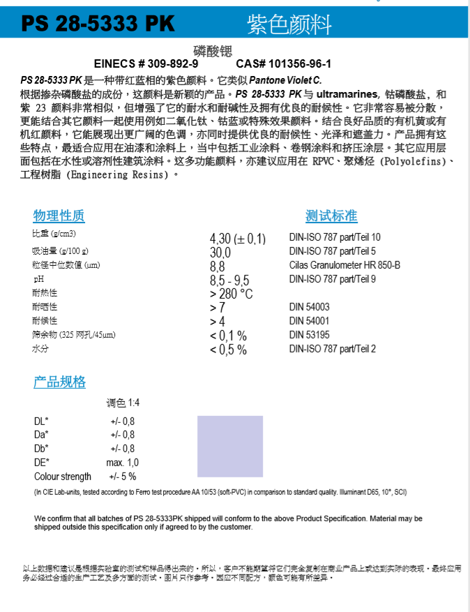产品型号Ferro高效能无机颜料PS 28-5333 PK 紫色颜料