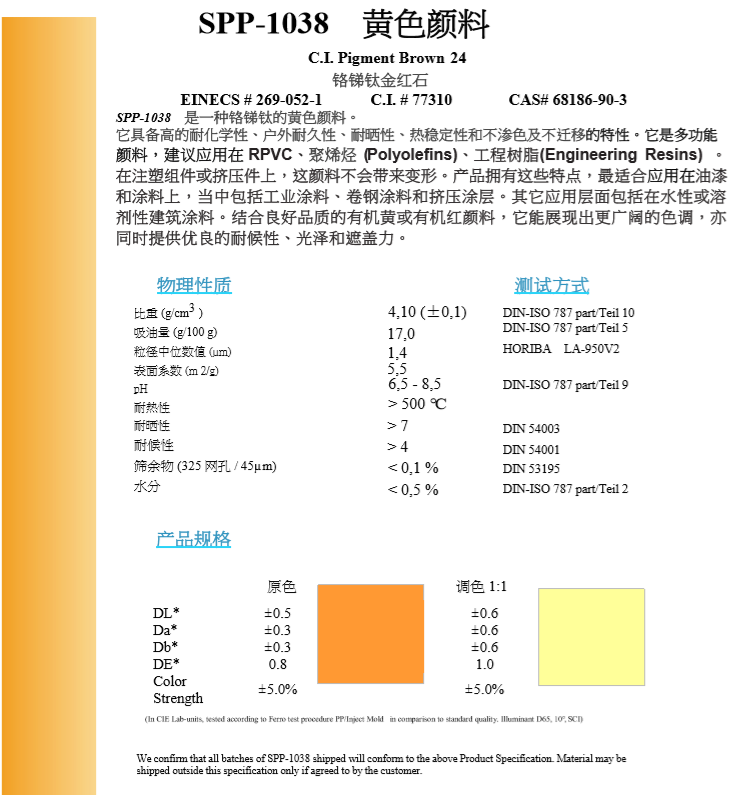 产品型号Ferro高效能无机颜料SPP-1038 黄色颜料