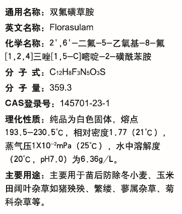 双氟磺草胺是继磺草唑胺、唑嘧磺草胺、氯酯磺草胺与双氯磺草胺之后于20世纪90年代中期开发成功的第五个三唑嘧啶磺酰胺类除草剂新品种。