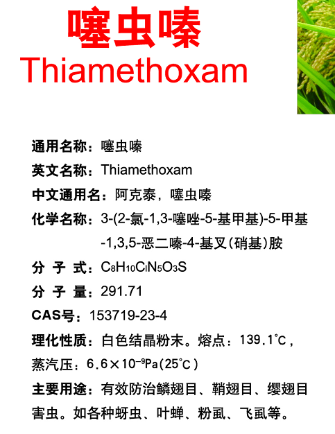 噻虫嗪是1991年由诺华公司开发的新烟碱类杀虫剂,其作用机理与吡虫啉相似,可选择性抑制昆虫中枢神经系统烟酸乙酰胆碱酯酶受体,进而阻断昆虫中枢神经系统的正常传导,造成害虫出现麻痹机时死亡。不仅具有触杀、胃毒、内吸活性,而且具有更高的活性、更好的安全性、更广的杀虫谱及作用速度快、持效期长等特点,是取代那些对哺乳动物毒性高、有残留和环境问题的有机磷、氨基甲酸酯、有机氯类杀虫剂的较好品种。对鞘Chemicalbook翅目、双翅目、鳞翅目,尤其是同翅目害虫有高活性,可有效防治各种蚜虫、叶蝉、飞虱类、粉虱、金龟子幼虫、马铃薯甲虫、线虫、地面甲虫、潜叶蛾等害虫及结多种类型化学农药产生抗性的害虫。与吡虫啉、啶虫脒、烯啶虫胺无交互抗性。既可用于茎叶处理、种子处理、也可用于土壤处理。适宜作物为稻类作物、甜菜、油菜、马铃薯、棉花、菜豆、果树、花生、向日葵、大豆、烟草和柑桔等。在推荐剂量下使用对作物安全、无药害。