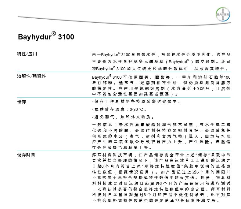 Bayhydur ® 3100 可 使 用 酯 类 、 醚 酯 类 、 二 甲 苯 和 溶 剂 石 脑 油100进 行 稀 释 。 通 常 与 上 述 溶 剂 相 容 性 好 , 但 仍 须 检 测 制 备 溶 液的 稳 定 性 。 应 使 用 聚 氨 酯 级 溶 剂 ( 水 含 量 低 于0.05 % , 且 溶 剂中 不 能 包 含 活 性 基 团 如 羟 基 或 氨 基 ) 。