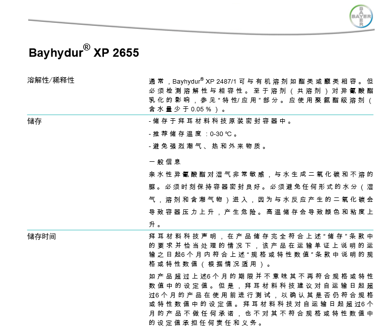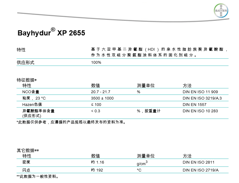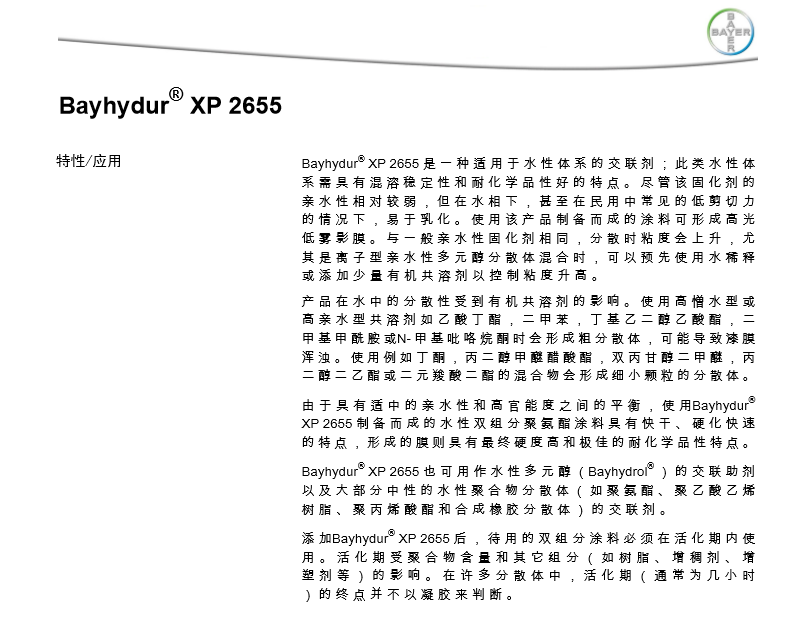 Bayhydur ® XP 2655 是 一 种 适 用 于 水 性 体 系 的 交 联 剂 ; 此 类 水 性 体系 需 具 有 混 溶 稳 定 性 和 耐 化 学 品 性 好 的 特 点 。 尽 管 该 固 化 剂 的亲 水 性 相 对 较 弱 , 但 在 水 相 下 , 甚 至 在 民 用 中 常 见 的 低 剪 切 力的 情 况 下 , 易 于 乳 化 。 使 用 该 产 品 制 备 而 成 的 涂 料 可 形 成 高 光低 雾 影 膜 。 与 一 般 亲 水 性 固 化 剂 相 同 , 分 散 时 粘 度 会 上 升 , 尤其 是 离 子 型 亲 水 性 多 元 醇 分 散 体 混 合 时 , 可 以 预 先 使 用 水 稀 释或 添 加 少 量 有 机 共 溶 剂 以 控 制 粘 度 升 高 。产 品 在 水 中 的 分 散 性 受 到 有 机 共 溶 剂 的 影 响 。 使 用 高 憎 水 型 或高 亲 水 型 共 溶 剂 如 乙 酸 丁 酯 , 二 甲 苯 , 丁 基 乙 二 醇 乙 酸 酯 , 二甲 基 甲 酰 胺 或N- 甲 基 吡 咯 烷 酮 时 会 形 成 粗 分 散 体 , 可 能 导 致 漆 膜