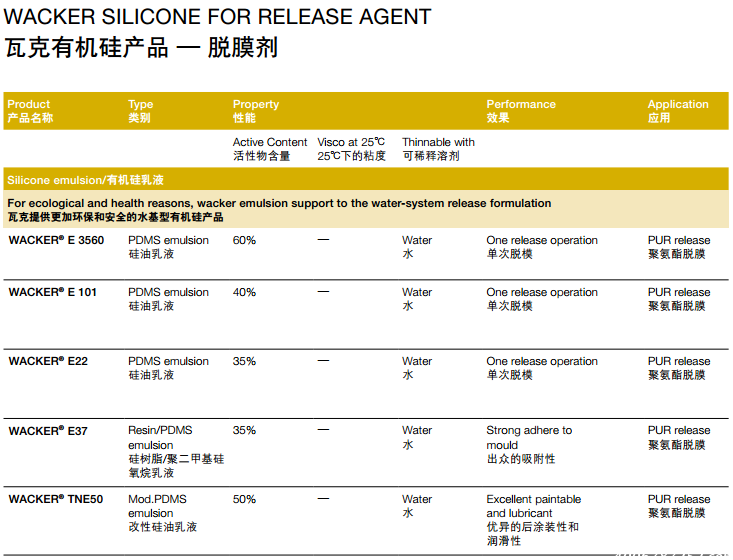 瓦克脱模剂E3560是水包油型聚二甲基硅氧烷的白色乳液,具有良好的稀释性,是通用型的橡胶和塑料脱模剂。