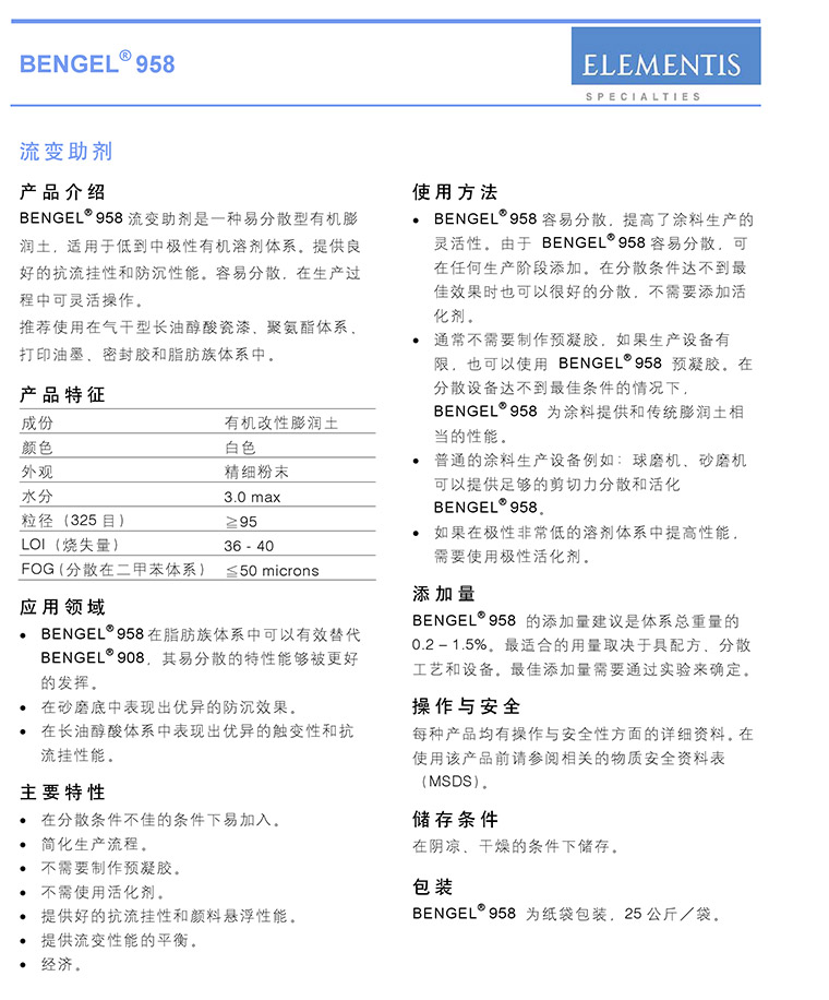 德谦海明斯BENGEL 958有机膨润土类流变助剂 产品资料下载列表: