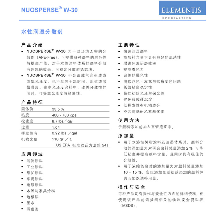 海明斯德谦润湿分散剂NUOSPERSE W-30 产品资料下载列表: