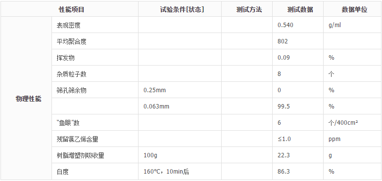 PVC树脂,物理外观为白色粉末, 、无臭。相对密度1.35-1.46,折射率1.544(20℃)不溶于水,汽油,酒精和氯乙烯,溶于丙酮,二氯乙烷,二甲苯等溶剂,化学稳定性很高,具有良好的可塑性。除少数有机溶剂外,常温下可耐任何浓度的盐酸、90% 以下的硫酸、50-60%的硝酸及20%以下的烧碱,此外,对于盐类亦相当稳定;