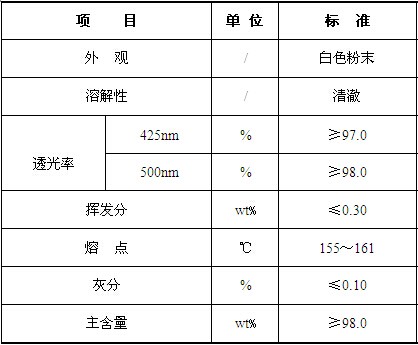 白色结晶粉末,溶于甲醇和氯仿,微溶于甲苯,几乎不溶于水。基本没毒。半致死量(白鼠LD50≥15000mg/kg),世界上许多发达国家如美国等均批准应用于接触食