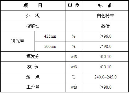 本品为本白色流动性结晶粉末,易溶于酮、酰胺、芳香烃等有机溶剂,如丙酮、DMF、甲苯、三氯甲烷等……微溶于甲醇、烷烃,不溶于水,可燃但不易燃。本品无