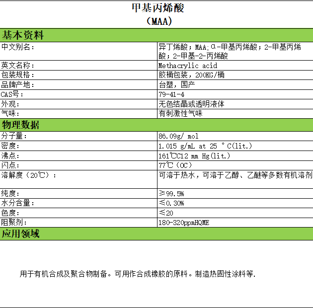 甲基丙烯酸酯类甲基丙烯酸(MAA) 产品资料下载列表: