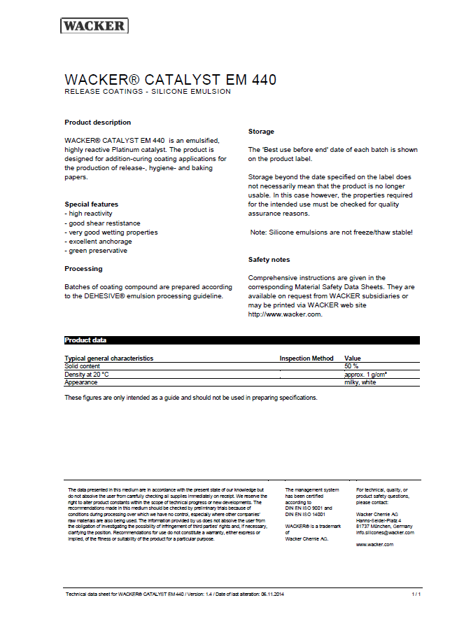 WACKER® CATALYST EM 440是一种乳化,高活性的铂催化剂。 该产品是专门设计的用于生产剥离纸,卫生纸和烘焙纸的加成固化涂料应用。