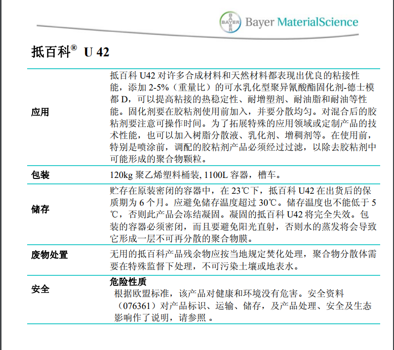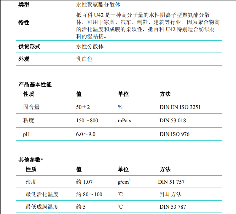商品名称:科思创(原 )水性聚氨酯抵百科Dispercoll U 42