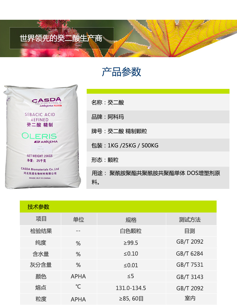 商品名称:阿科玛 精制99.5%颗粒癸二酸 皮脂酸 多元醇专用 进口原料