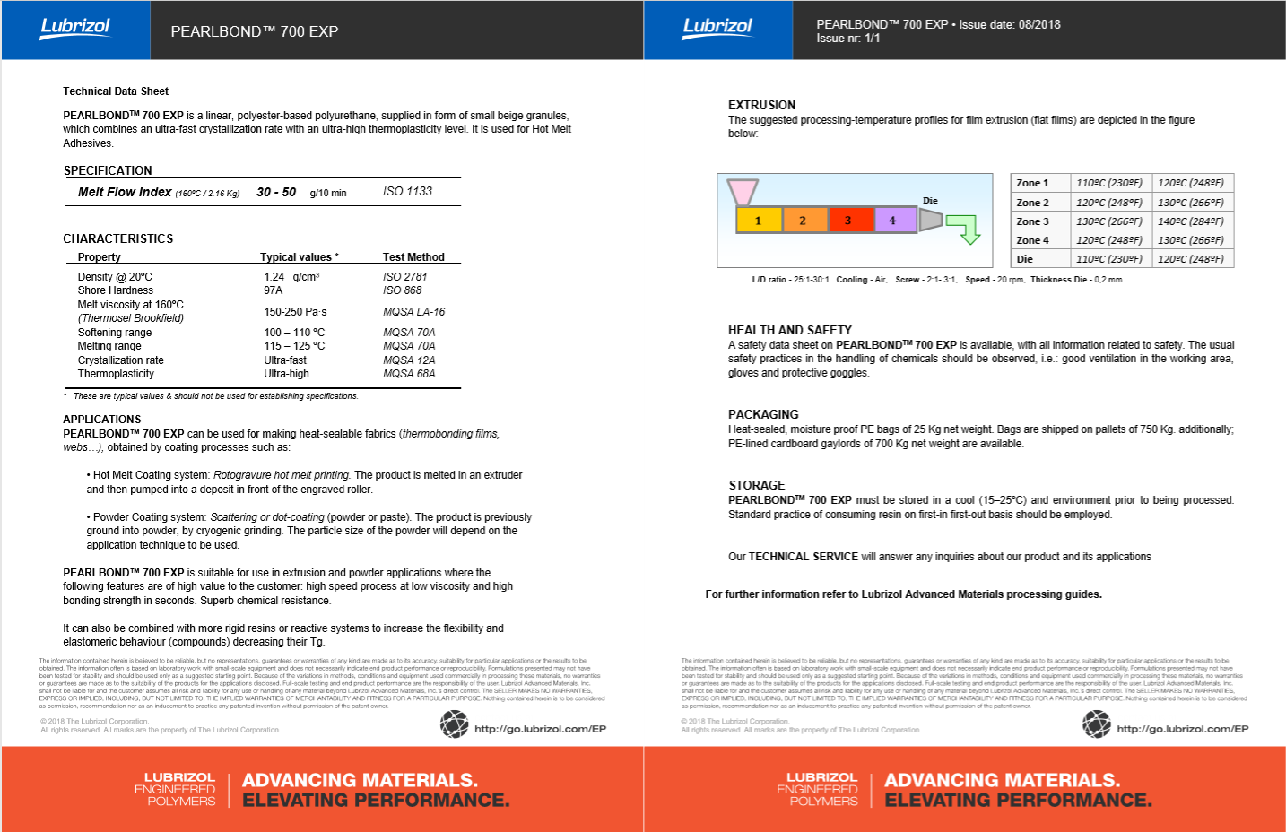 产品型号路博润 PEARLBOND™ 700 EXP
