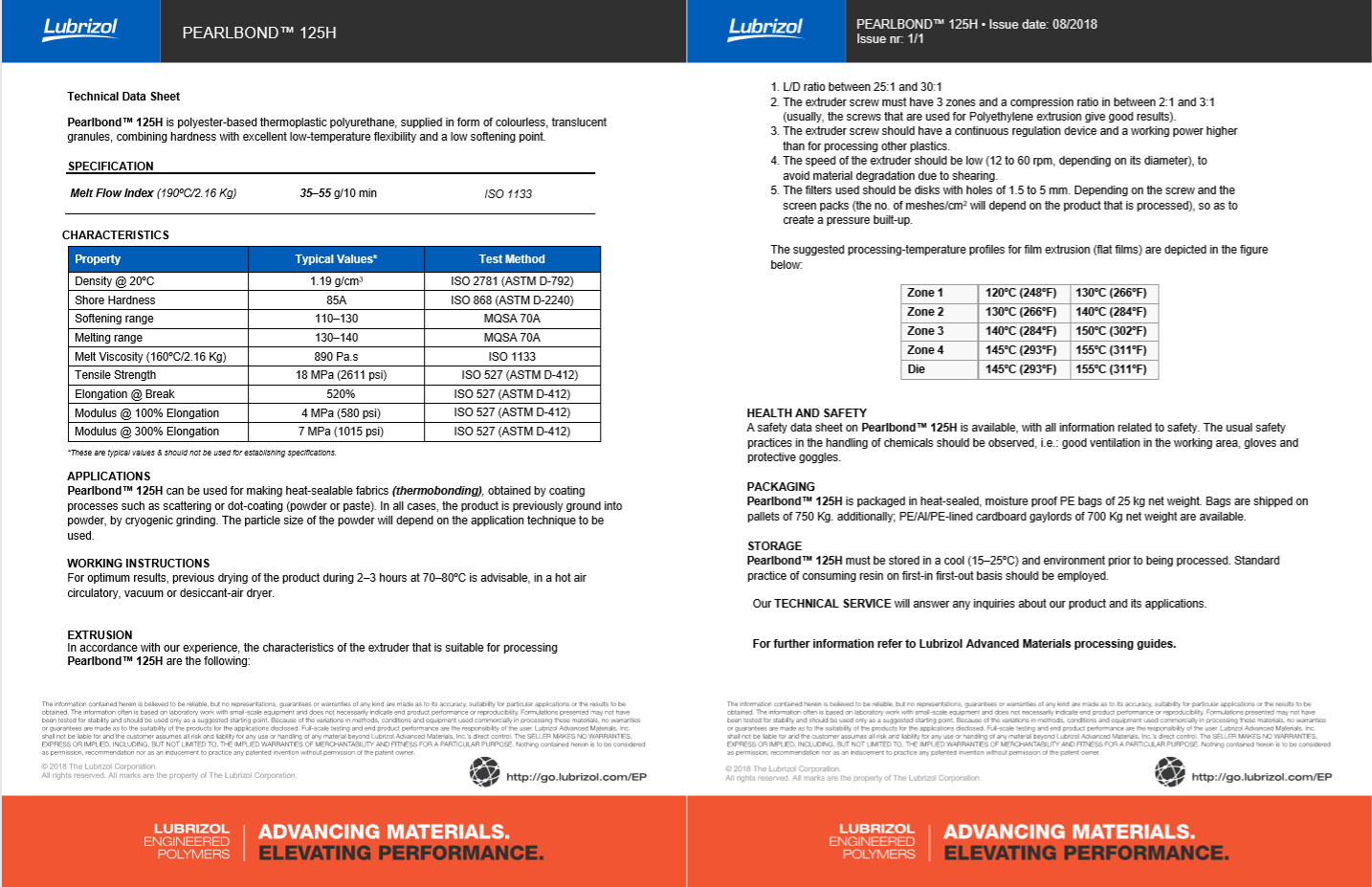 产品型号路博润 PEARLBOND™ 125H