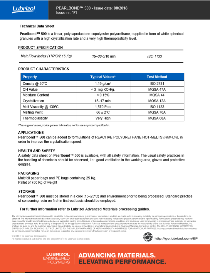产品型号路博润PEARLBOND™ 500