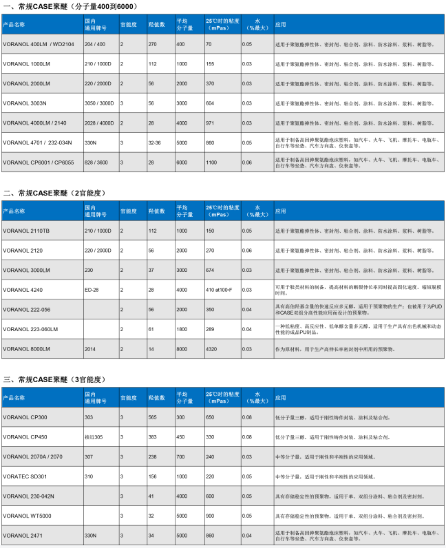 分子量4000~6000: VORANOL400LM;VORANOL1000LM;VORANOL 2000LM;VORANOL4000LM/2140;VORANOL 4701/232-034N;VORANOL CP6001/CP6055;