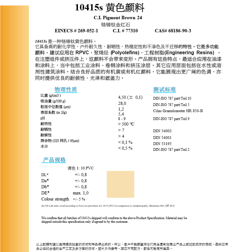 产品型号Ferro高效能无机颜料10415s 黄色颜料