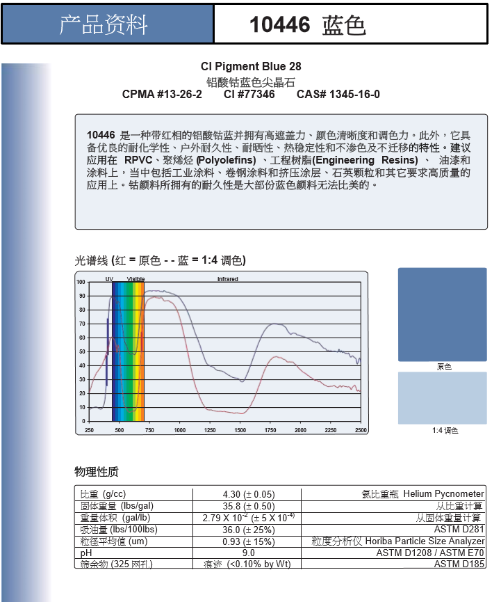 美国福禄公司(Ferro)是 全Q最大的特种材料制造商之一,业务范围涵盖搪瓷瓷釉、陶瓷瓷釉、色素、电子材料、塑料化合物、聚合物添加剂几大领域;福禄无机复合颜料具有高度热稳定性,耐光性,抗化学性及耐候性等特点,特別为户外建筑应用、聚氯乙烯壁板及型材、卷钢等而设,亦可用于对效能有高质素要求的工程塑料、伪装涂料以及其他户外涂料等产品。