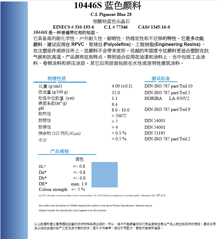 美国福禄公司(Ferro)是 全Q最大的特种材料制造商之一,业务范围涵盖搪瓷瓷釉、陶瓷瓷釉、色素、电子材料、塑料化合物、聚合物添加剂几大领域;福禄无机复合颜料具有高度热稳定性,耐光性,抗化学性及耐候性等特点,特別为户外建筑应用、聚氯乙烯壁板及型材、卷钢等而设,亦可用于对效能有高质素要求的工程塑料、伪装涂料以及其他户外涂料等产品。