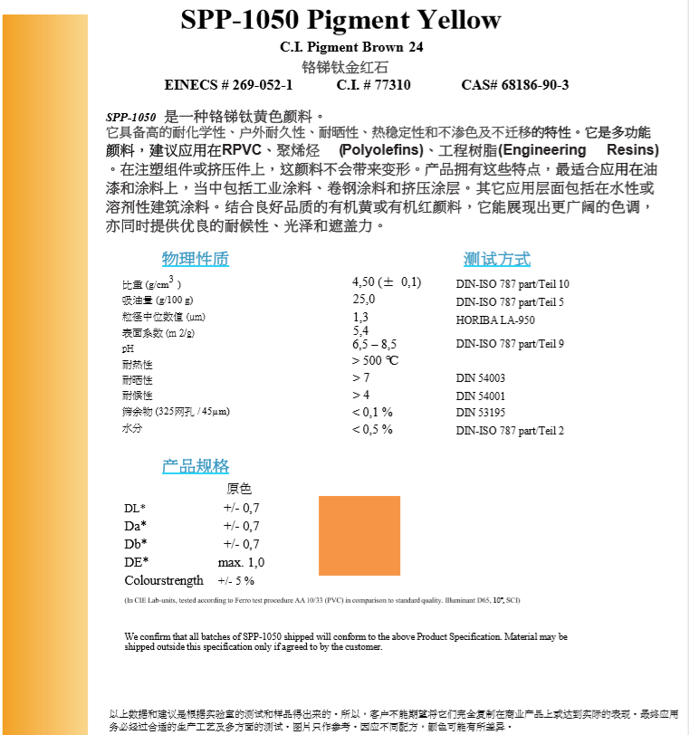 美国福禄公司(Ferro)是 全Q最大的特种材料制造商之一,业务范围涵盖搪瓷瓷釉、陶瓷瓷釉、色素、电子材料、塑料化合物、聚合物添加剂几大领域;福禄无机复合颜料具有高度热稳定性,耐光性,抗化学性及耐候性等特点,特別为户外建筑应用、聚氯乙烯壁板及型材、卷钢等而设,亦可用于对效能有高质素要求的工程塑料、伪装涂料以及其他户外涂料等产品。