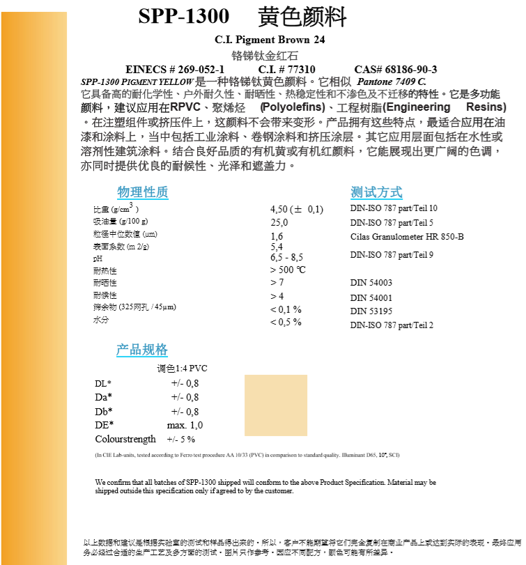 美国福禄公司(Ferro)是 全Q最大的特种材料制造商之一,业务范围涵盖搪瓷瓷釉、陶瓷瓷釉、色素、电子材料、塑料化合物、聚合物添加剂几大领域;福禄无机复合颜料具有高度热稳定性,耐光性,抗化学性及耐候性等特点,特別为户外建筑应用、聚氯乙烯壁板及型材、卷钢等而设,亦可用于对效能有高质素要求的工程塑料、伪装涂料以及其他户外涂料等产品。