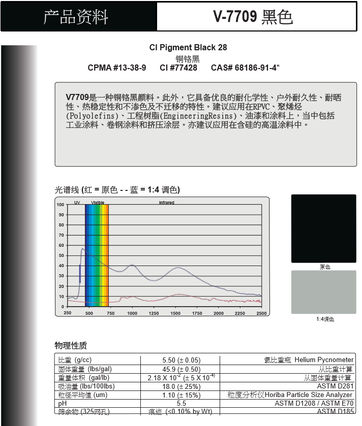 美国福禄公司(Ferro)是 全Q最大的特种材料制造商之一,业务范围涵盖搪瓷瓷釉、陶瓷瓷釉、色素、电子材料、塑料化合物、聚合物添加剂几大领域;福禄无机复合颜料具有高度热稳定性,耐光性,抗化学性及耐候性等特点,特別为户外建筑应用、聚氯乙烯壁板及型材、卷钢等而设,亦可用于对效能有高质素要求的工程塑料、伪装涂料以及其他户外涂料等产品。
