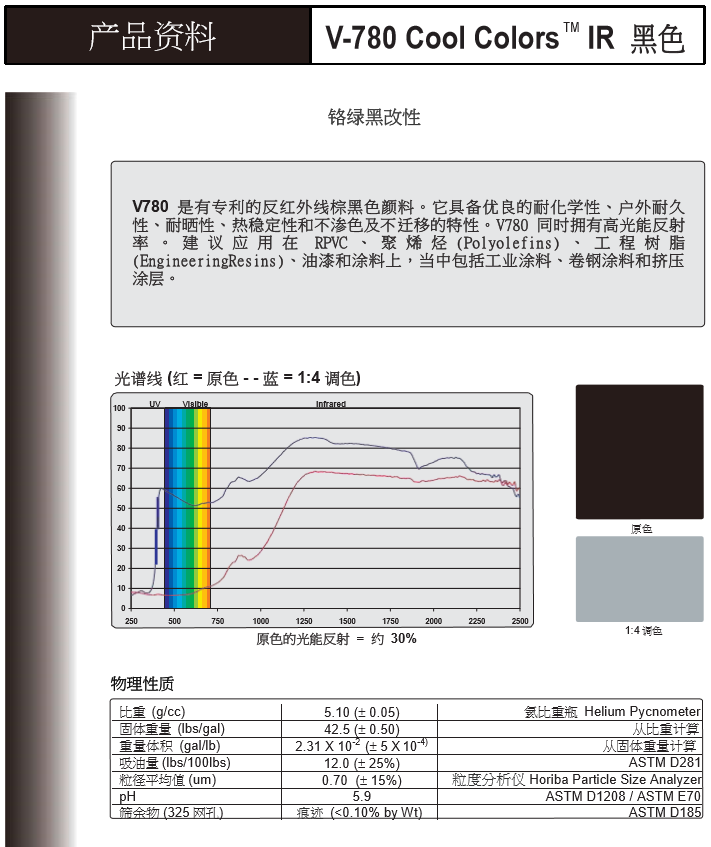 美国福禄公司(Ferro)是 全Q最大的特种材料制造商之一,业务范围涵盖搪瓷瓷釉、陶瓷瓷釉、色素、电子材料、塑料化合物、聚合物添加剂几大领域;福禄无机复合颜料具有高度热稳定性,耐光性,抗化学性及耐候性等特点,特別为户外建筑应用、聚氯乙烯壁板及型材、卷钢等而设,亦可用于对效能有高质素要求的工程塑料、伪装涂料以及其他户外涂料等产品。