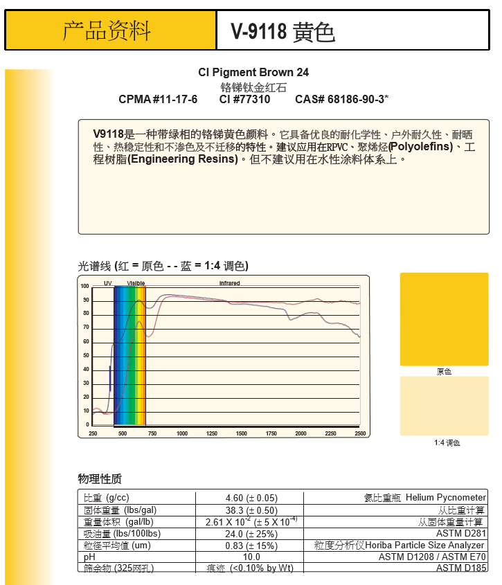 美国福禄公司(Ferro)是 全Q最大的特种材料制造商之一,业务范围涵盖搪瓷瓷釉、陶瓷瓷釉、色素、电子材料、塑料化合物、聚合物添加剂几大领域;福禄无机复合颜料具有高度热稳定性,耐光性,抗化学性及耐候性等特点,特別为户外建筑应用、聚氯乙烯壁板及型材、卷钢等而设,亦可用于对效能有高质素要求的工程塑料、伪装涂料以及其他户外涂料等产品。