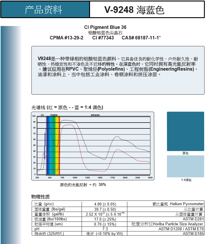 美国福禄公司(Ferro)是 全Q最大的特种材料制造商之一,业务范围涵盖搪瓷瓷釉、陶瓷瓷釉、色素、电子材料、塑料化合物、聚合物添加剂几大领域;福禄无机复合颜料具有高度热稳定性,耐光性,抗化学性及耐候性等特点,特別为户外建筑应用、聚氯乙烯壁板及型材、卷钢等而设,亦可用于对效能有高质素要求的工程塑料、伪装涂料以及其他户外涂料等产品。
