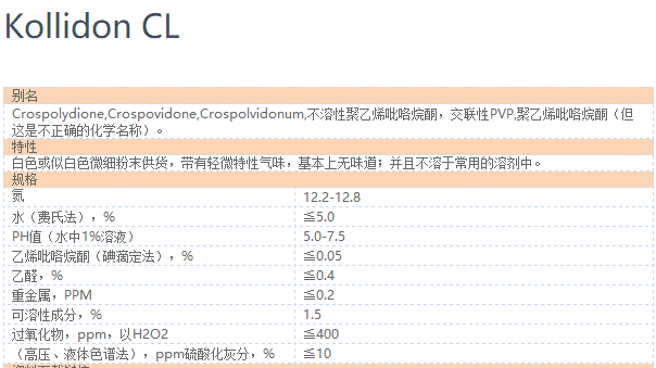产品特性:Crospolydione.Crospovidone,Crospolwidonum,不溶性聚乙烯吡咯烷酮,交联性PVP聚乙烯吡咯烷酮(但这是不正确的化学名称)。