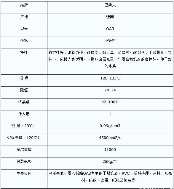巴斯夫蜡粉Luwax OA是一种氧化改性的聚乙烯蜡,适合用于乳化蜡行业,具有性价比高,硬度高等性能特点。