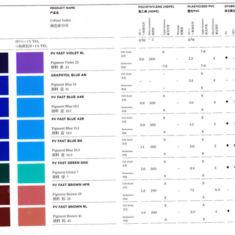 有机颜料用于各种聚合物中,此类颜料在聚合物中具有卓越的热稳定性,耐光性和耐渗色性。主要应用于工程塑料、塑料色母粒、塑胶染色、PMMA着色等行业中,具有颜色鲜艳、着色力高、耐侯性好、加工温度高等优点、科莱恩颜料,在软质塑料中具有着色力高,耐晒牢度优(7-8级),热稳定性高(200-300度),耐迁移性好等优点。