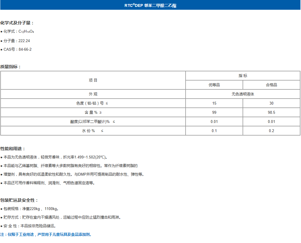 产品型号润泰RTC®DEP 邻苯二甲酸二乙酯