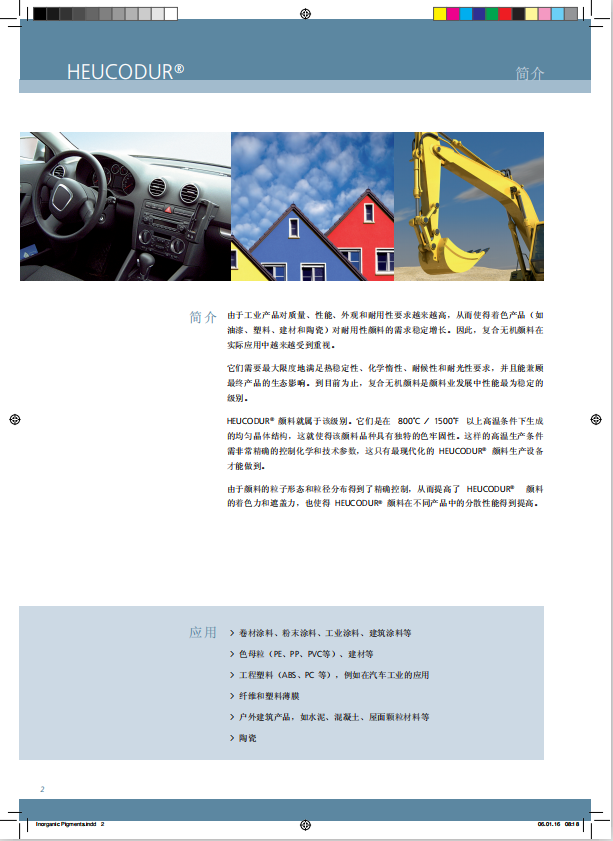 随着消费品和工业品的质量和性能不断改进,他们对外观和牢度性能需求也越来越高。这类产品如涂料,塑料,建筑材料和陶器产品对着色牢度性能高的颜料需求持续增长。HEUCODUR®颜料正符合这类需求。