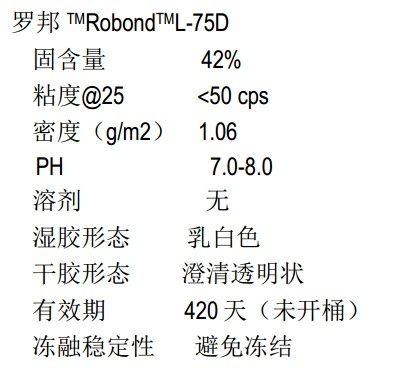 1.陶氏罗邦Robond 75D水性粘合剂典型数据指标: