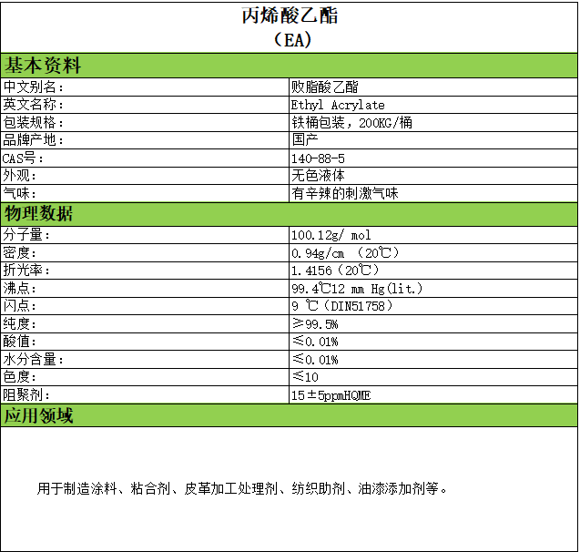 商品名称:丙烯酸酯类丙烯酸乙酯(EA)