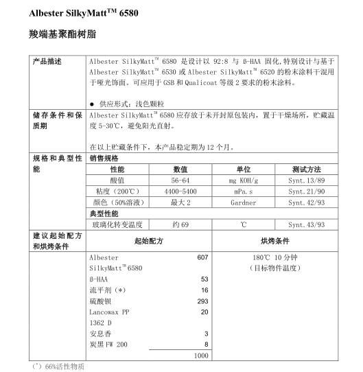 Albester SilkyMatt 6580是设计以92:8与BHMA固化,特别设计与基于Albester SilkyMatt 6530或 Albester SilkyMatt 6520的粉末涂料干混用于哑光饰面。可应用于GSB和 Qualicoat等级2要求的粉末涂
