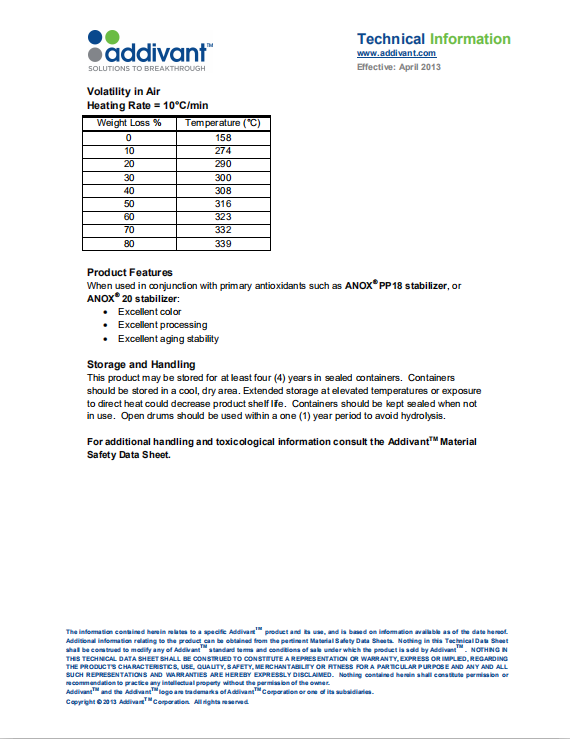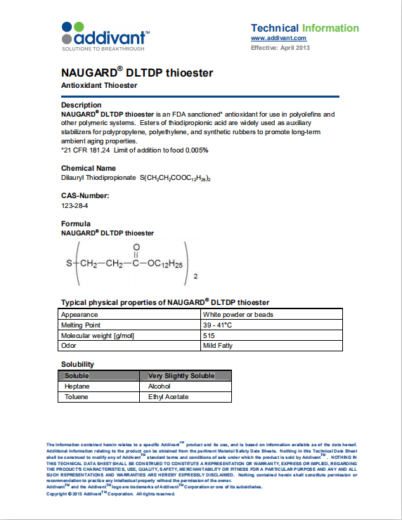 抗氧剂DLTDP化学名称为硫代二丙酸双十二醇酯,分子量514.86。白色粉末或鳞片状物,相对密度(d20 4)0.915~0.965。熔点39.5~41.5℃。溶于甲苯、丙酮、溶剂汽油,难溶于乙醇,不溶于水。低毒,LDso>2500mg/kg。