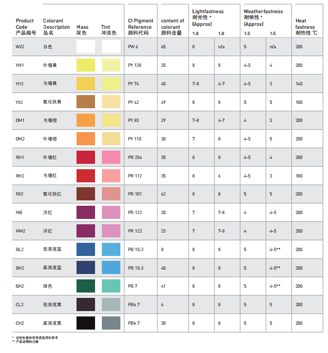 产品特性:该色浆体系不含APE,VOC含量小于50g每升,与各种水性涂料具有良好的相容性。它们既可以手工调色也可以使用机器自动调色,对于店头调色均使用。