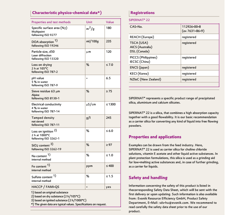 举例来说,在饲料业中,SIPERNAT 22可以用作氯化胆碱溶液、维生素E醋酸酯以及其他液体活性物质的载体;在农作物保护配方中,这种二氧化硅可以作为低熔点活性物质的研磨助剂,在进一步研磨时可以用作液体的载体。