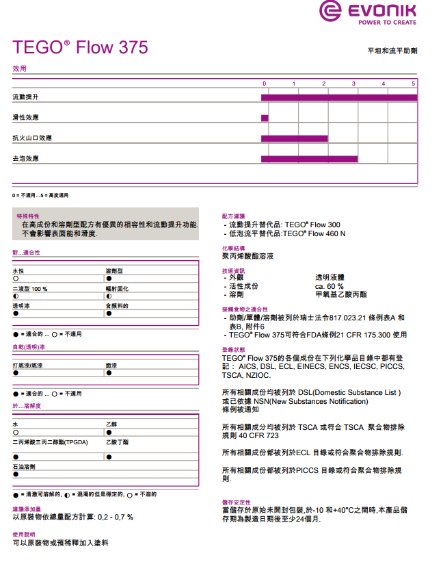 三、特性 1、用于溶剂型配方 2、显著改善流动性 3、在喷涂施工表现长波效应 4、高相容性(发雾的风险减至好低) 5、热稳定 6、良好的重涂性 7、不含有机硅