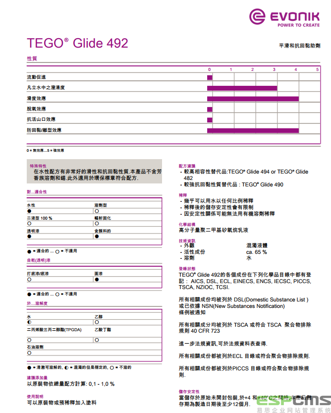 三、特性 1、用于溶剂型配方 2、显著改善流动性 3、在喷涂施工表现长波效应 4、高相容性(发雾的风险减至好低) 5、热稳定 6、良好的重涂性 7、不含有机硅