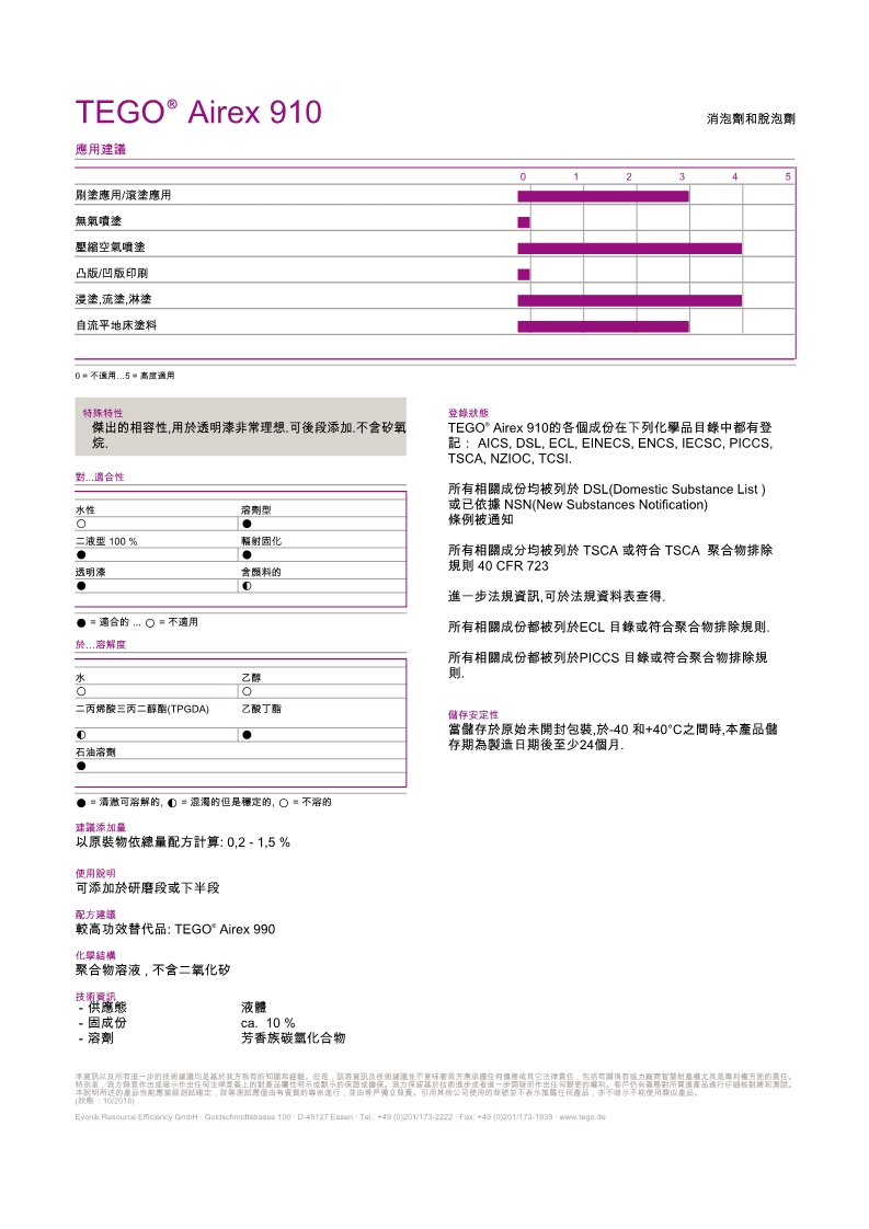 TEGO Airex 990消泡剂用于溶剂型,无溶剂型和幅射固化涂料的脱泡剂。TEGO Airex 990脱泡剂具高相容性,不含有机硅,特别适用于清漆系统和淋涂施工。